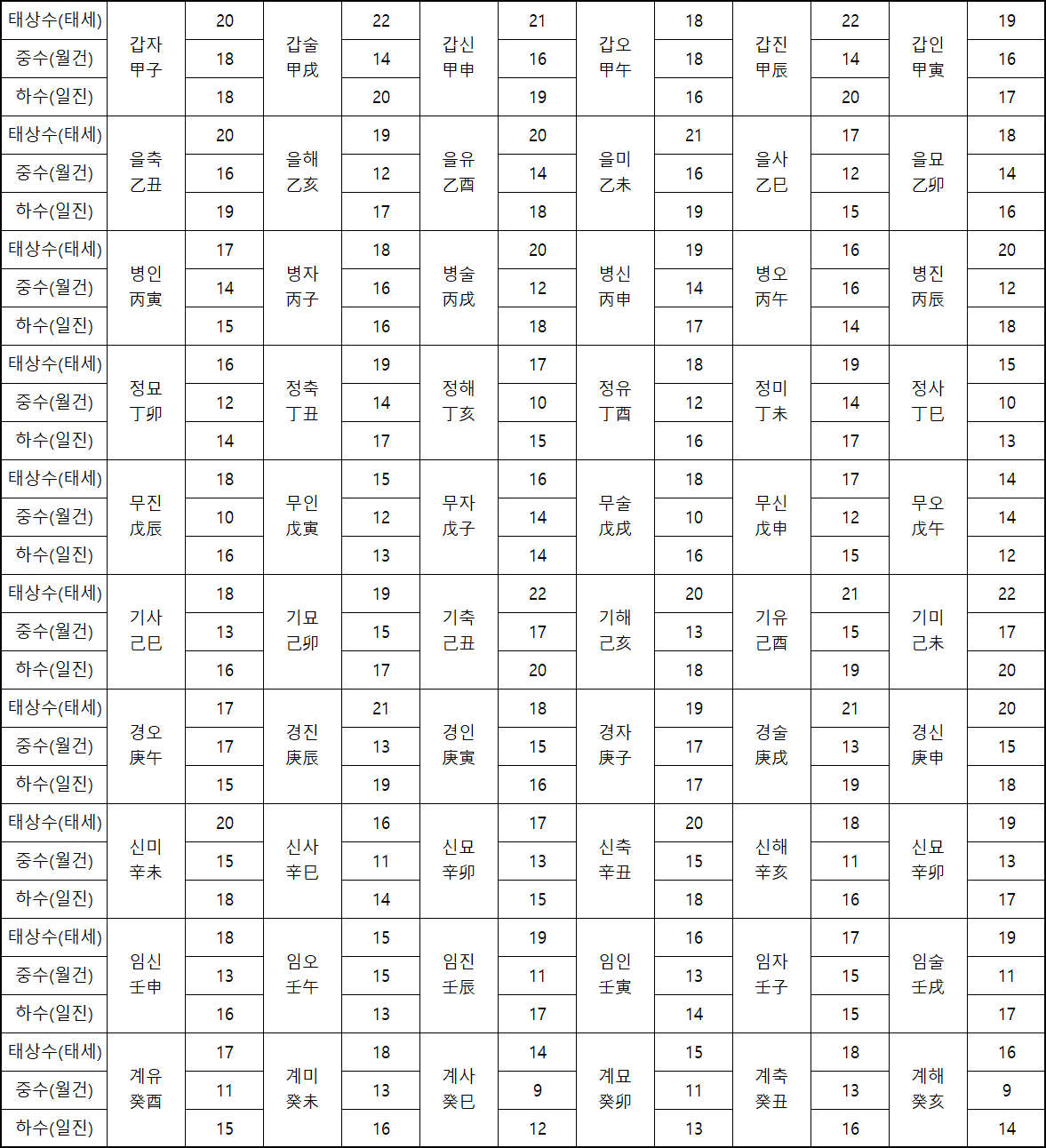4. 아래의 표에서 음력간지에 대한 태상수, 중수(월건), 하수(일진)를 구한다.