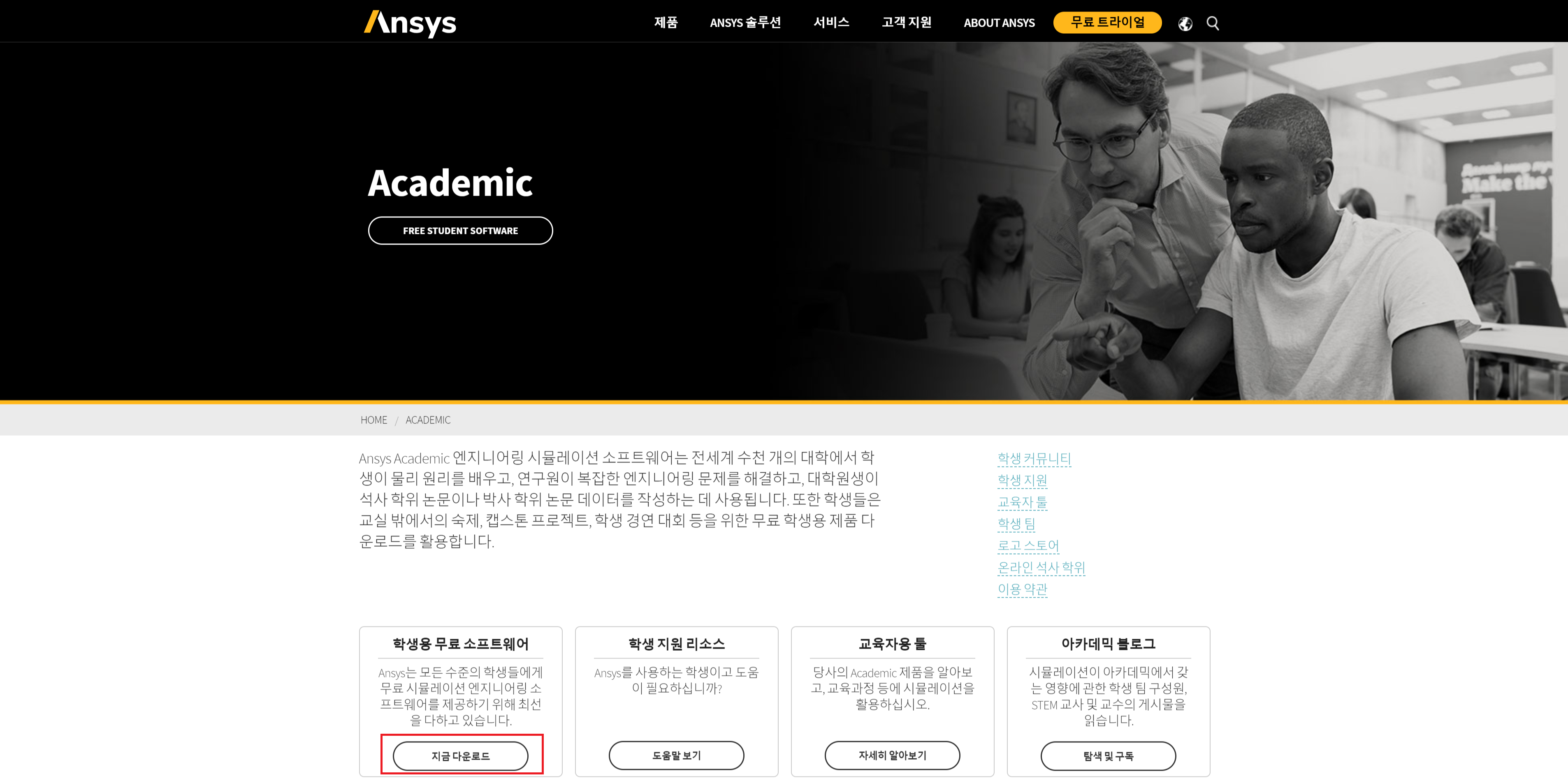Academic 화면에서는 아래의 4가지 항목 중에 '학생용 무료 소프트웨어' 항목에 있는 '지금 다운로드' 버튼을 클릭하면 무료 학생용 제품을 다운로드할 수 있는 페이지로 전환된다.