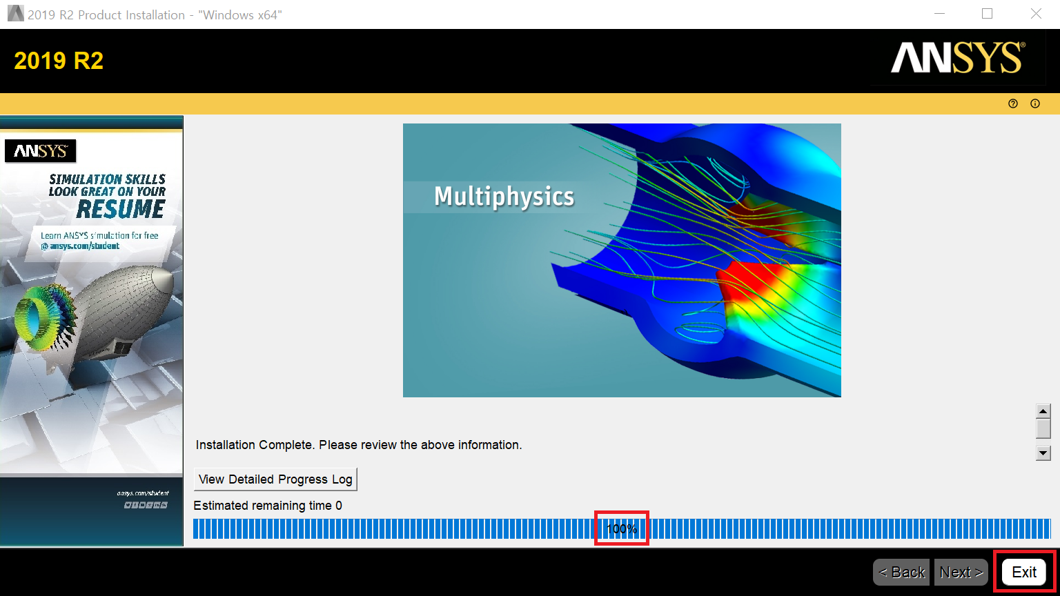 설치가 100% 완료되면 'Next'가 아니라 'Exit'를 클릭해서 설치를 종료한다.