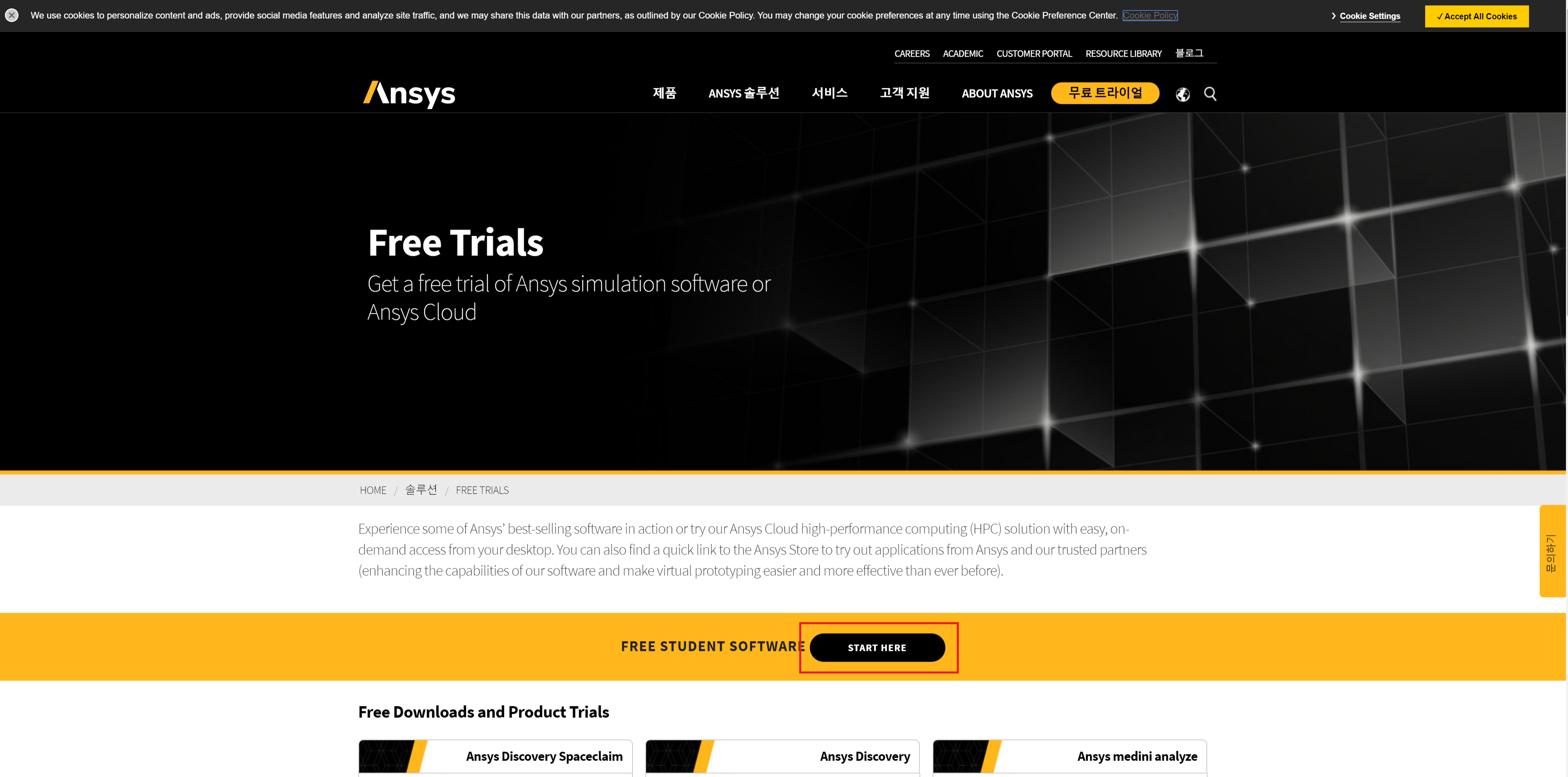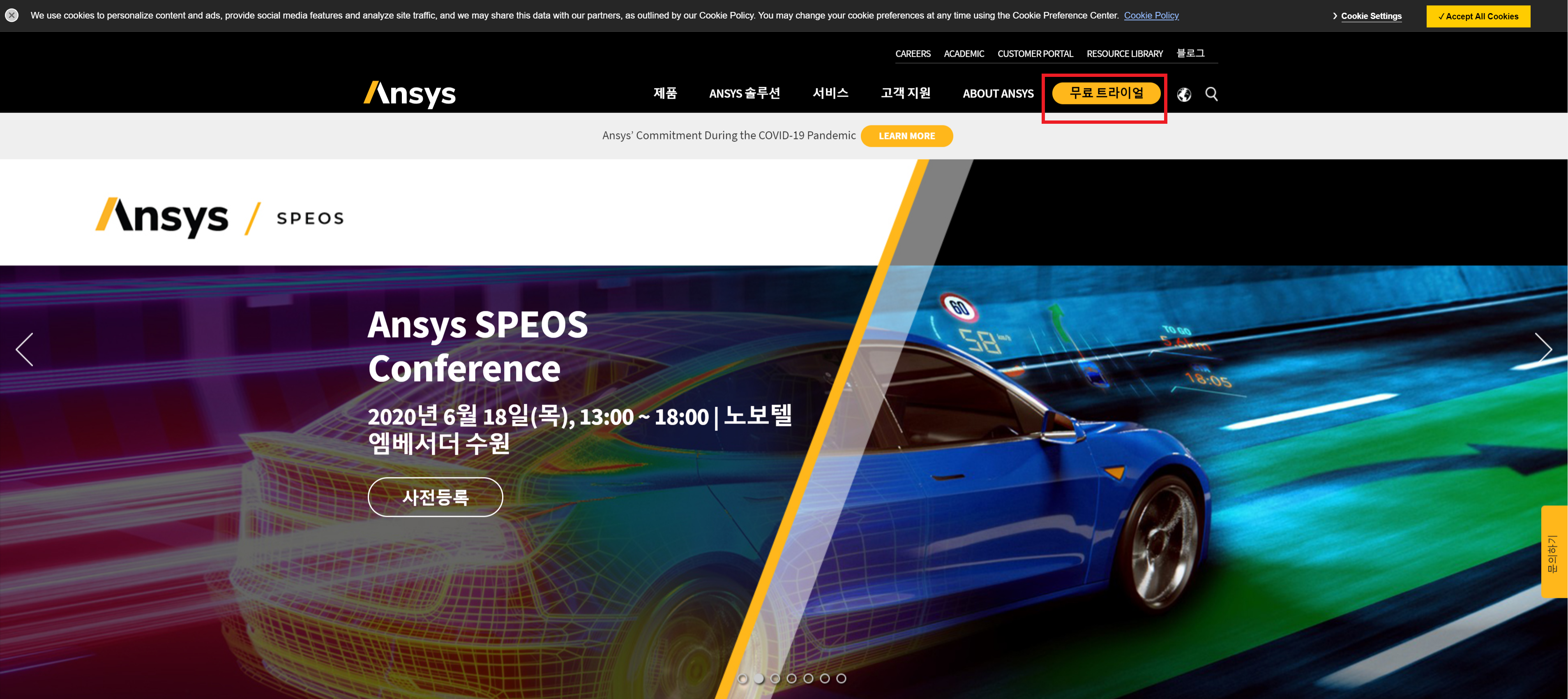 검색사이트에서 'ANSYS'를 검색해서 'ANSYS 공식 홈페이지'를 클릭하거나 www.ansys.com/ko-kr을 입력하여 ANSYS 공식 홈페이지로 이동 후, '무료 트라이얼' 항목을 선택한다.