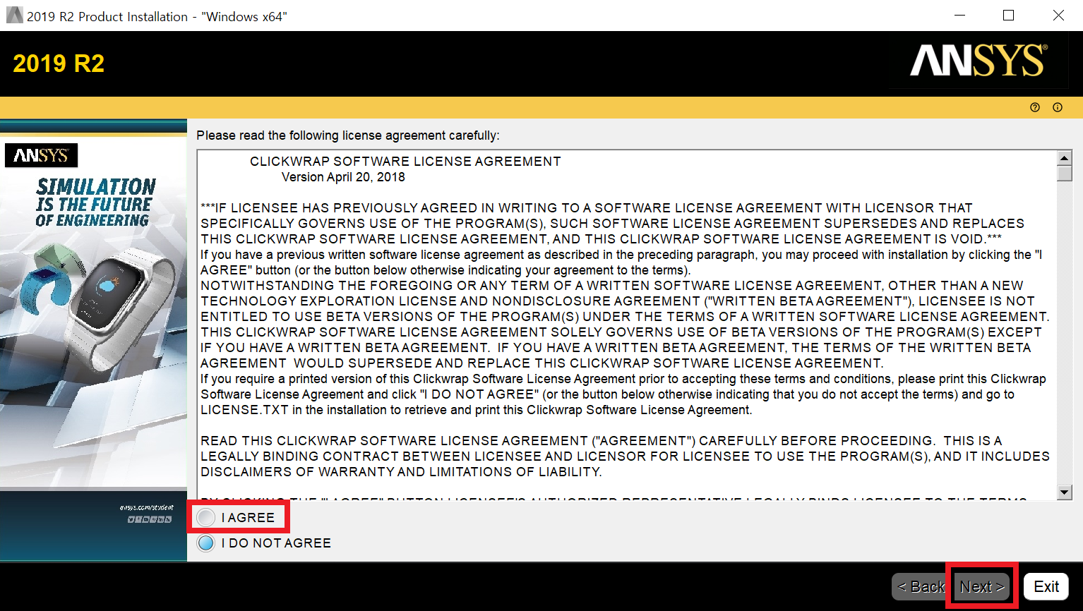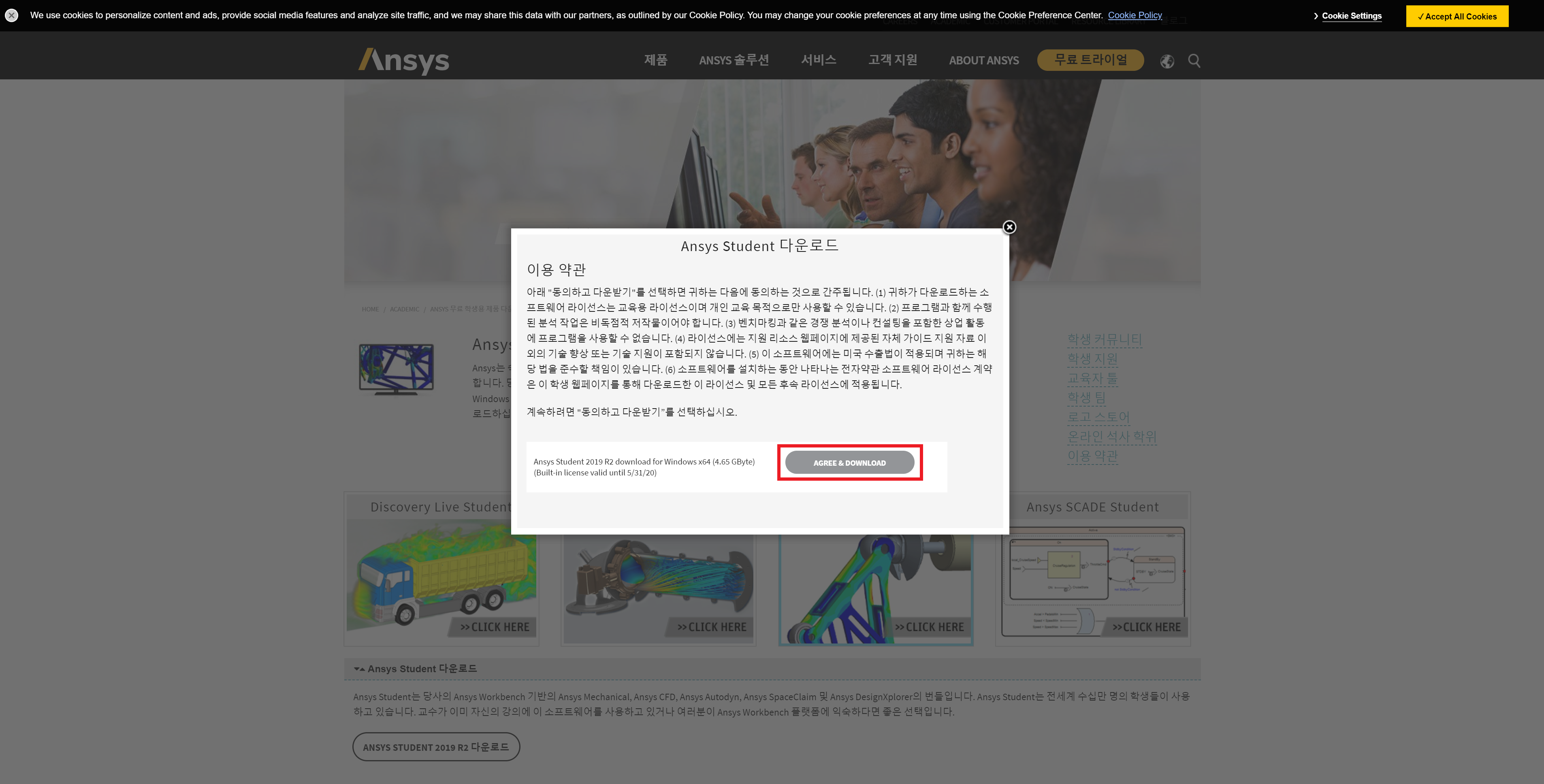ANSYS 무료 학생용 제품 다운로드 페이지에서 'Ansys Student - ANSYS STUDENT 2019 R2 다운로드'를 클릭하면 이용약관을 확인하는 창이 나타나고 'AGREE & DOWNLOAD'를 클릭하면 설치파일 다운로드가 시작된다.