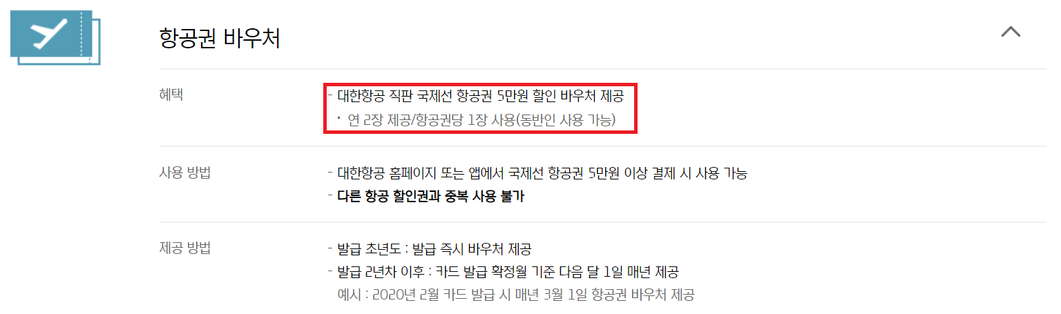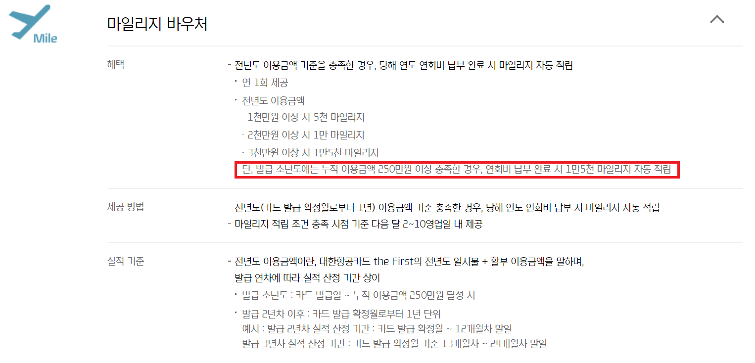 그리고 마일리지 적립이나 공항 라운지 이용, 발레파킹, 커피전문점 할인 등 당연히 있어야 할 혜택 말고 대한항공 the first의 바우처 혜택을 보면, 발급 초년도에 250만 원을 결제할 경우, 발급 2년 차 때 3,000만 원을 결제한 만큼의 혜택을 받을 수 있다.