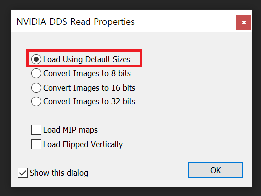 lua파일 수정이 완료되면 DDS파일을 포토샵으로 불러오는데 'NVIDIA DDS Read Properties' 창이 나타나면 ''Load Using Default Sizes'가 선택된 것을 확인하고 OK'를 클릭한다.