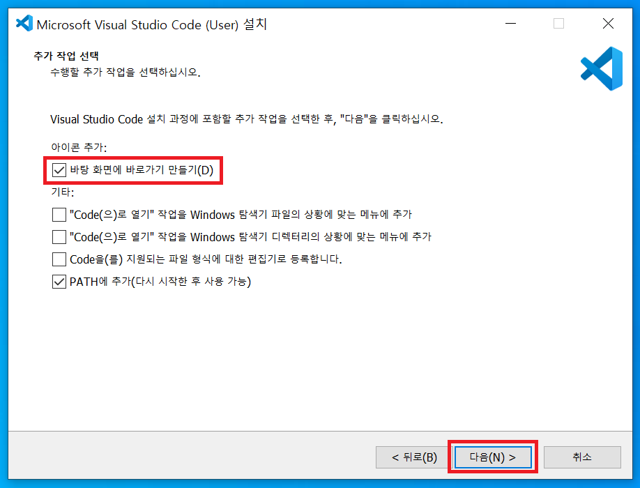 추가 작업 선택 항목에서 '바탕화면에 바로가기 만들기'를 체크하고 '다음'을 클릭하면 설치 준비가 완료되고 '설치'를 클릭하면 설치가 시작된다.