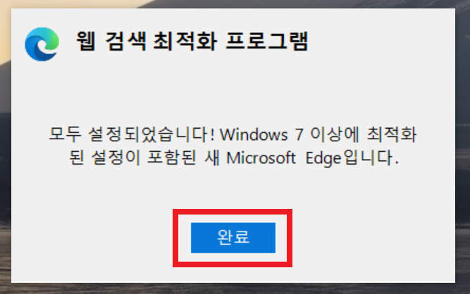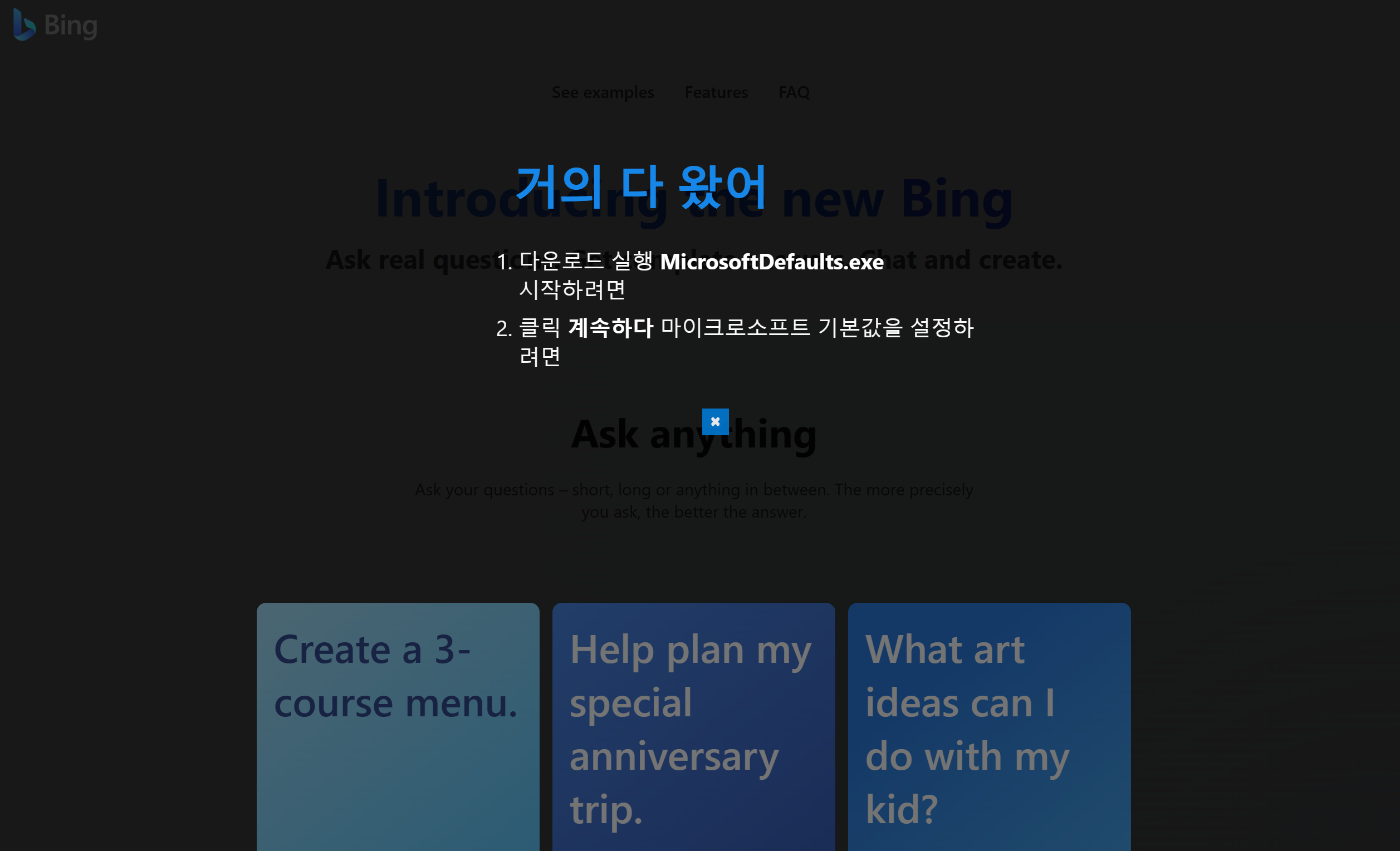 설정이 완료되고나면 '완료'를 클릭해서 프로그램을 종료시키고 몇 일 정도 있다가 빙(Bing) 사이트에서 챗GPT가 적용된 빙(Bing)을 이용할 수 있다.