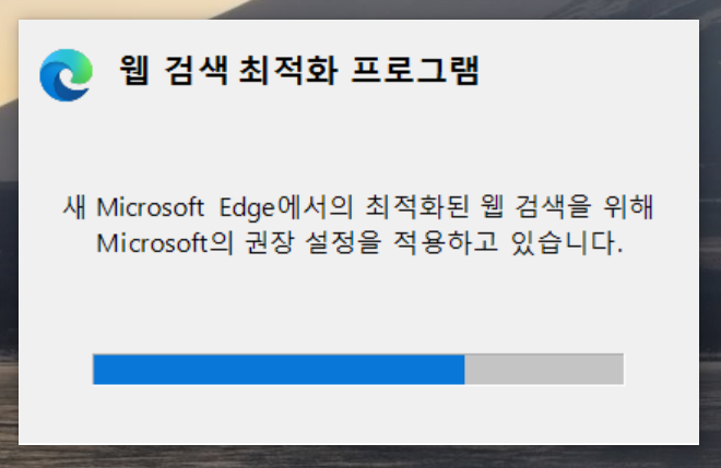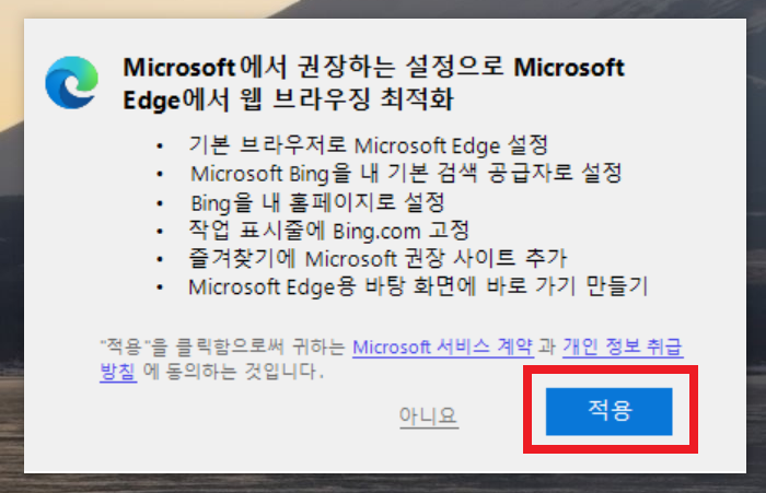 설치파일을 실행시키면 아래와 같이 새로운 빙(Bing)에 더 빠르게 액세스 하기위한 조건들을 보여주는데, 우선은 동의를 하고, 설정이 완료된 이후에 다시 변견하면 되므로 '적용'을 클릭해서 자동 설정을 진행한다.