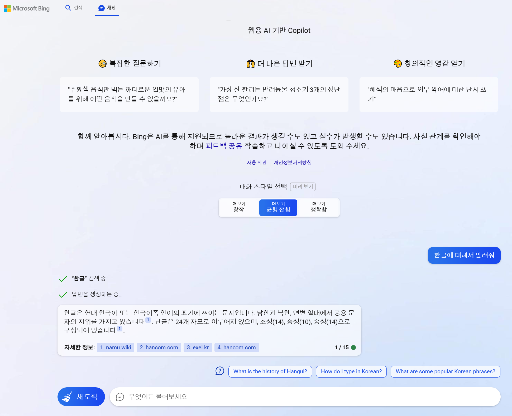 지난번 챗GPT와 동일하게 '한글에 대해서 알려줘' 라는 질문을 해보니, 상대적으로 챗GPT 보다는 짧은 답변을 하지만, 특정 질문에 대해서 답변을 하는 동시에 결론을 지어서 말하려고 하는 챗GPT와는 다르게, 질문자에게 추가적인 질문을 유도해서 좀 더 질문자의 의도를 파악하고 그에 맞춰서 답변을 하려고 하는 의도인 것 같다.