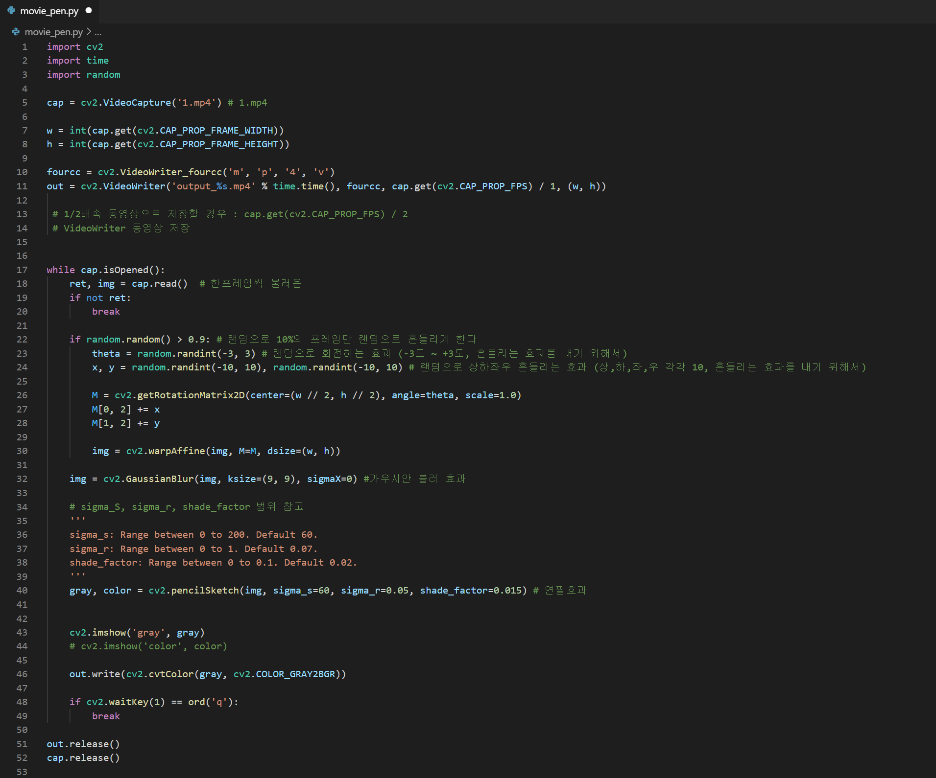 코드 작성이 완료되면, 적당한 동영상 파일을 구해서 '1.mp4'로 저장한 후, movie_pen.py 파일과 같은 폴더로 이동시켜준다.