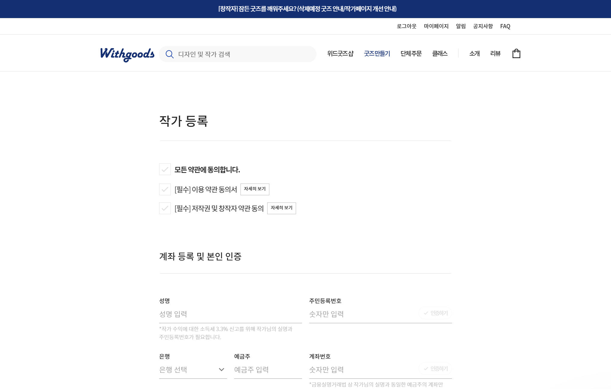 작가 등록 페이지에서 굿즈를 판매하기 위한 작가 등록 약관에 동의하고 주민등록번호, 휴대폰 번호, 은행계좌 등 본인인증을 진행한다.