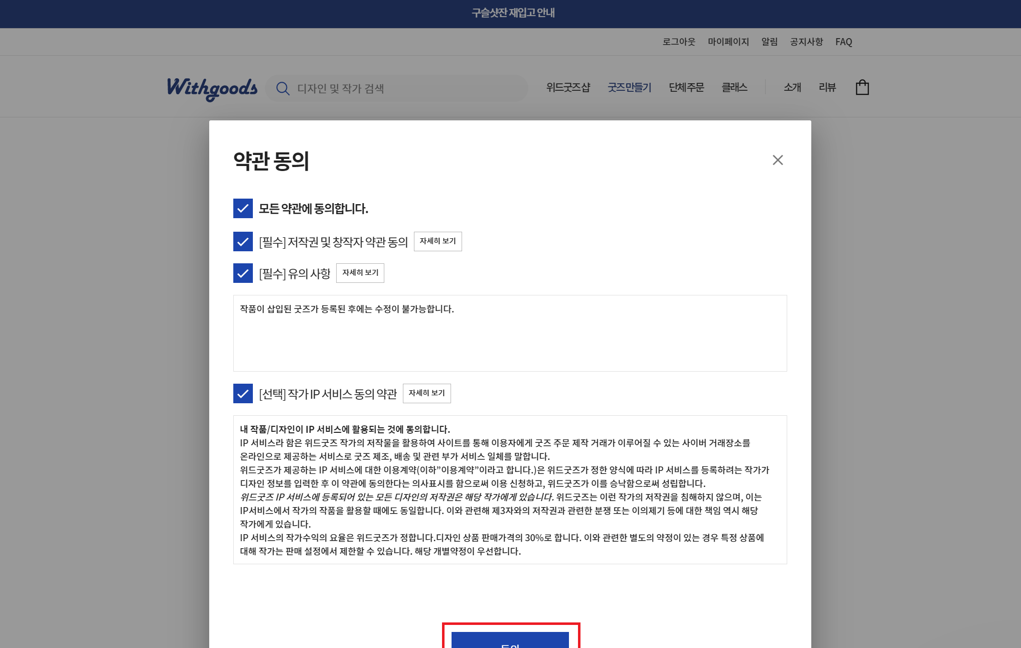 디자인 업로드 페이지에서 '디자인 업로드'를 클릭하면, 다시 한번 디자인 등록과 관련된 약관을 동의하고 디자인 등록 페이지로 이동한다.