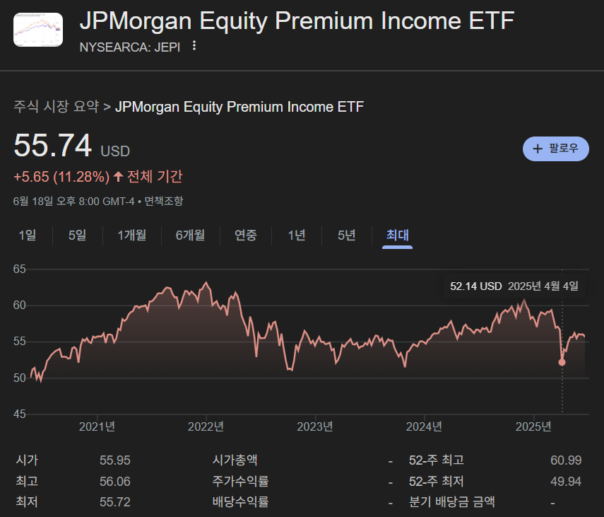 JEPI는 JPMorgan Equity Premium Income의 줄인말로 미국의 자산운용사 JP모건이 운용하는 ETF다. 2024년 12월 31일 기준으로 연 배당률 8.08%의 고배당 ETF이며 배당 주기는 매월 배당을 하고 있다.