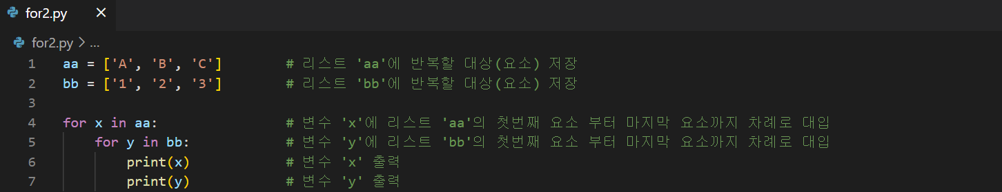 aa = ['A', 'B', 'C'] # 리스트 'aa'에 반복할 대상(요소) 저장