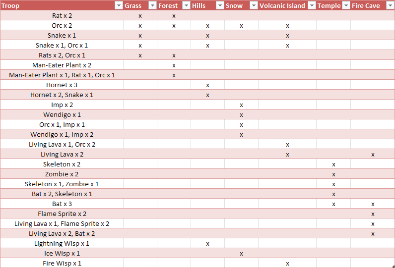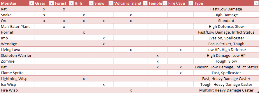 가장 먼저 해야 할 일은 각 조우 지역에 대한 적을 만드는 것입니다. 이 작업을 수행하는 가장 쉬운 방법은 적과 영역을 일치시키는 다른 스프레드시트를 만드는 것입니다. 나는 영역과 사용 가능한 그래픽의 조합을 사용하여 괴물 아이디어를 배치하기 시작합니다. 지역에 맞는지 확인하십시오.