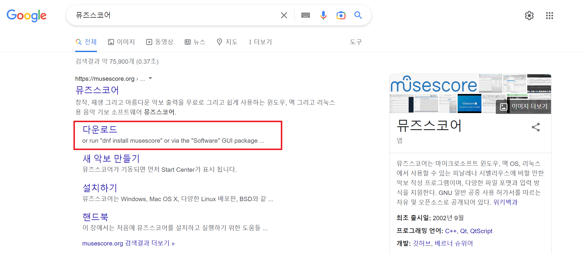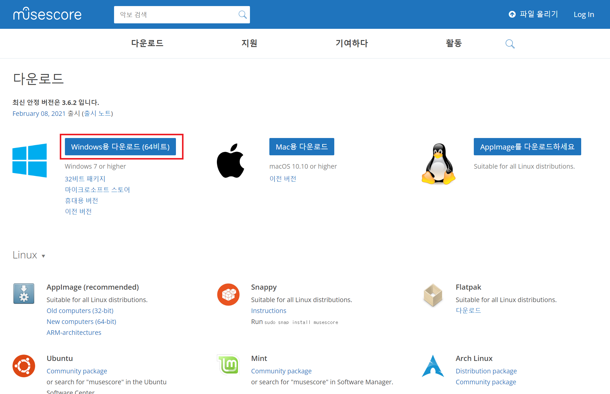 검색사이트에서 '뮤즈스코어'를 검색해서 '다운로드'를 클릭하여 '뮤즈스코어' 공식 홈페이지의 다운로드 페이지로 이동 후, 'Windows용 다운로드 (64비트)' 항목을 선택하면 설치 파일이 다운로드된다.