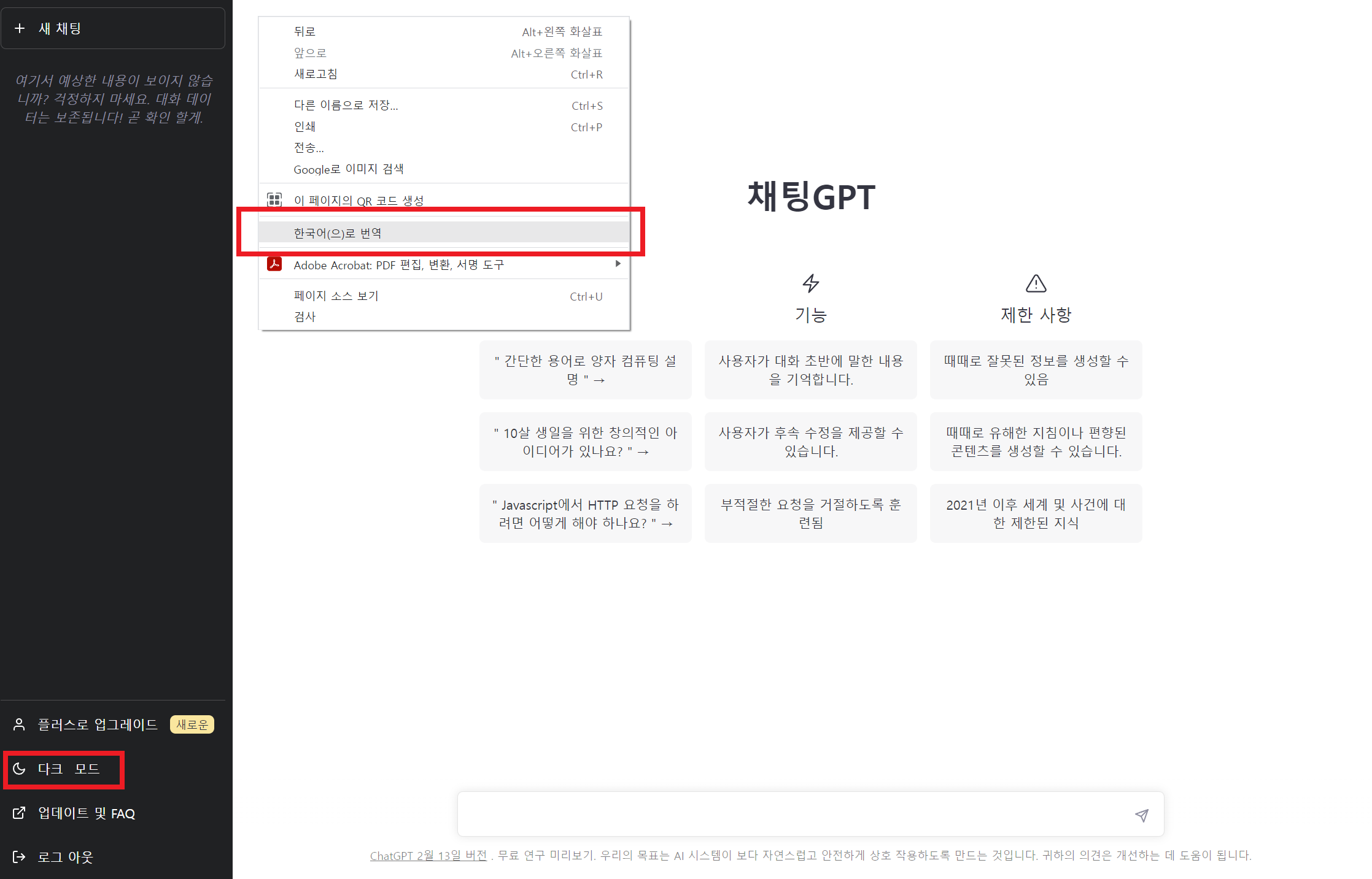 크롬 브라우저 사용 기준으로 빈 공간에서 마우스 우클릭을 하고 '한국어 번역'기능도 사용가능하고, 입력창에 한글로 입력하면 자동으로 답변이 한글로 출력되고 좌측하단에 메뉴를 보면 다크모드도 지원한다.