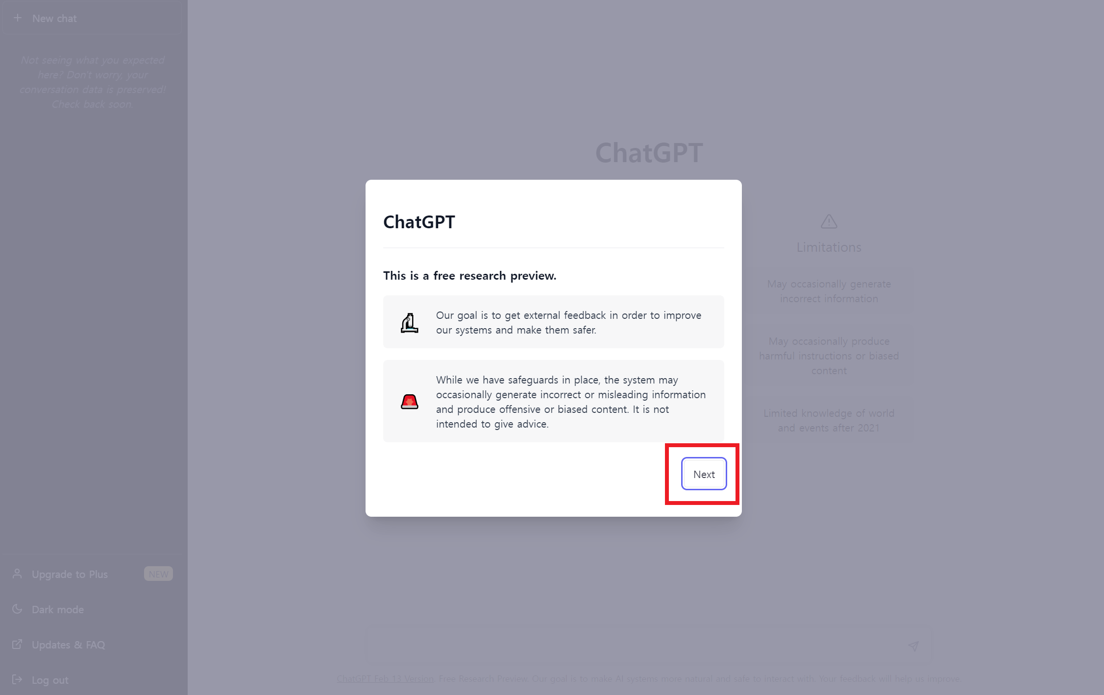 안내사항은 구글 번역기나 크롬 브라우저의 번역 기능을 이용해서 확인하고 'Next'나 'Done'을 눌러서 넘어가면 ChatGPT에게 물어볼 수 있는 몇 가지 예시, 제한사항 등과 함께 입력창이 나타난다.