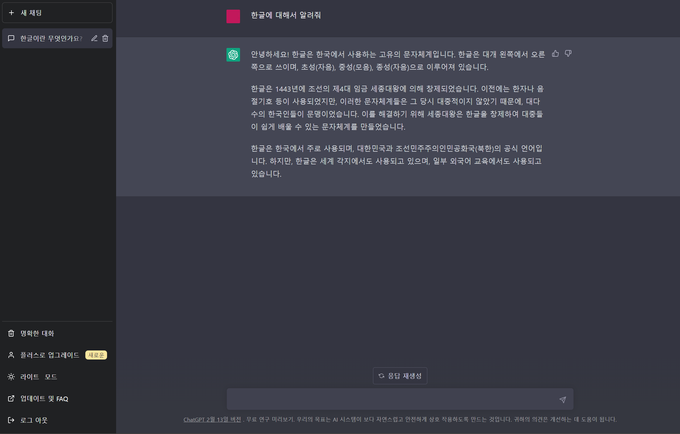 ChatGPT 계정생성을 완료하고 첫 번째 질문으로 한글에 대해서 물어보니 아래와 같이 답변이 출력되는 것을 확인할 수 있다.