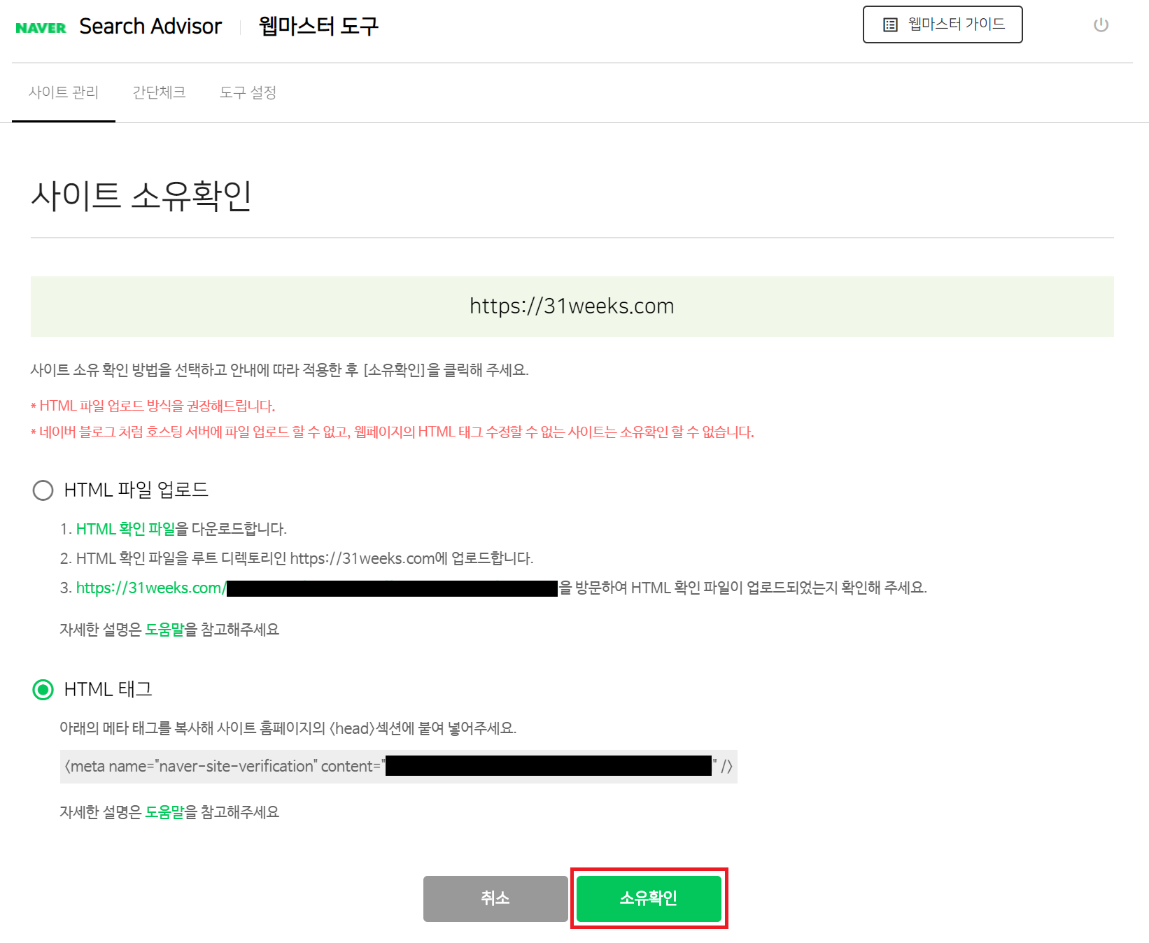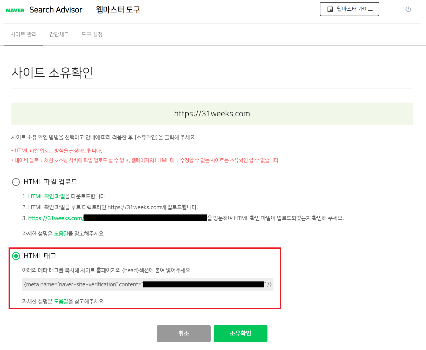 블로그 주소를 입력하고 엔터키를 누른 후, 아래의 화면이 나오면 'html 태그'를 선택하고 메타 태그를 복사(Ctrl+C)한 뒤, 네이버 서치어드바이저 페이지는 잠시 이대로 둔다.