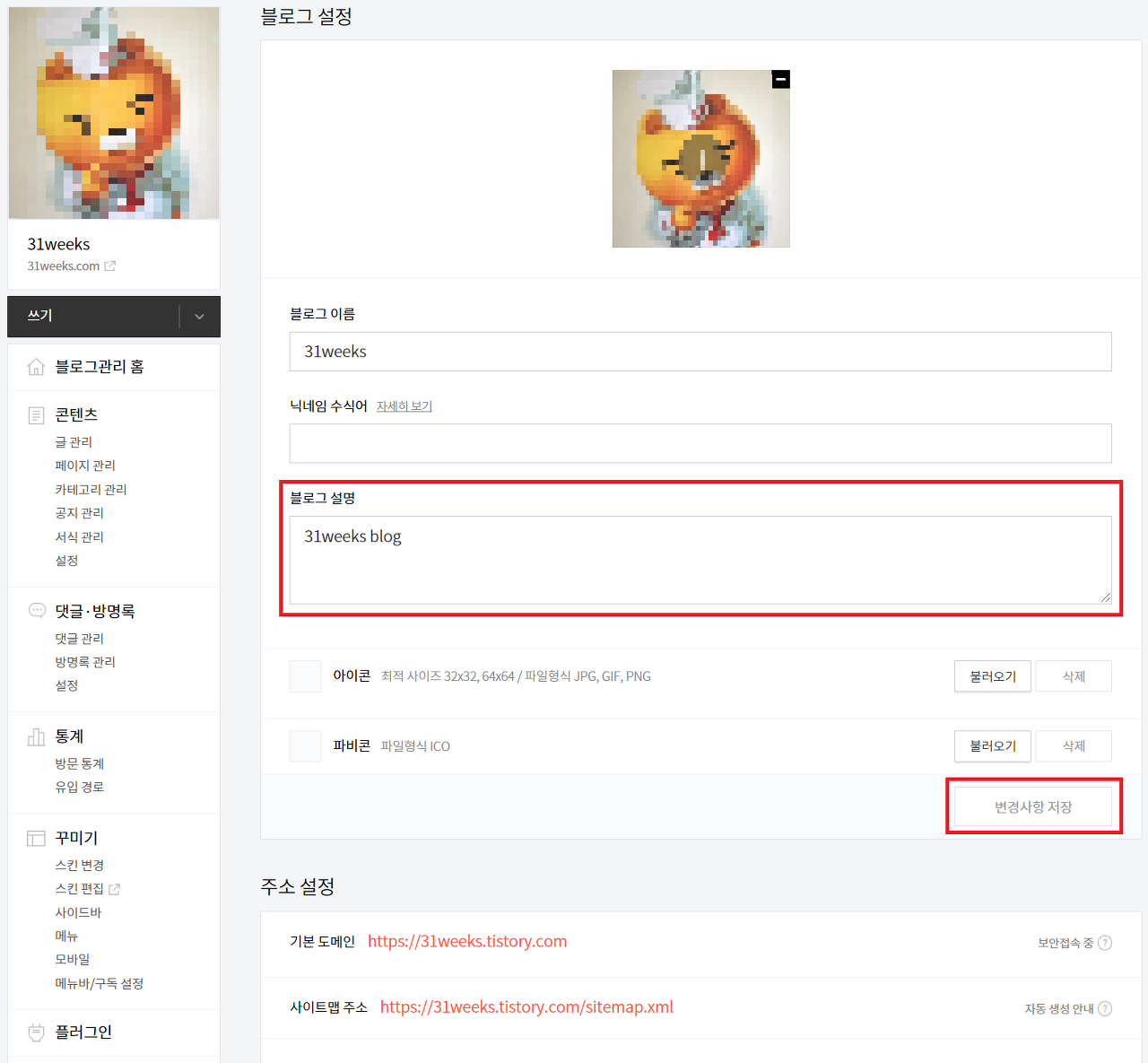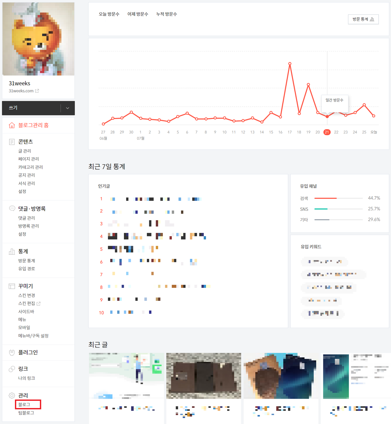 진단 상태가 x로 표시된 '사이트 설명'과 'Open Graph 설명' 항목에 대해서는 다시 티스토리 블로그의 '블로그관리 홈' 페이지로 이동하여 좌측 메뉴 중, '블로그'를 클릭한다.
