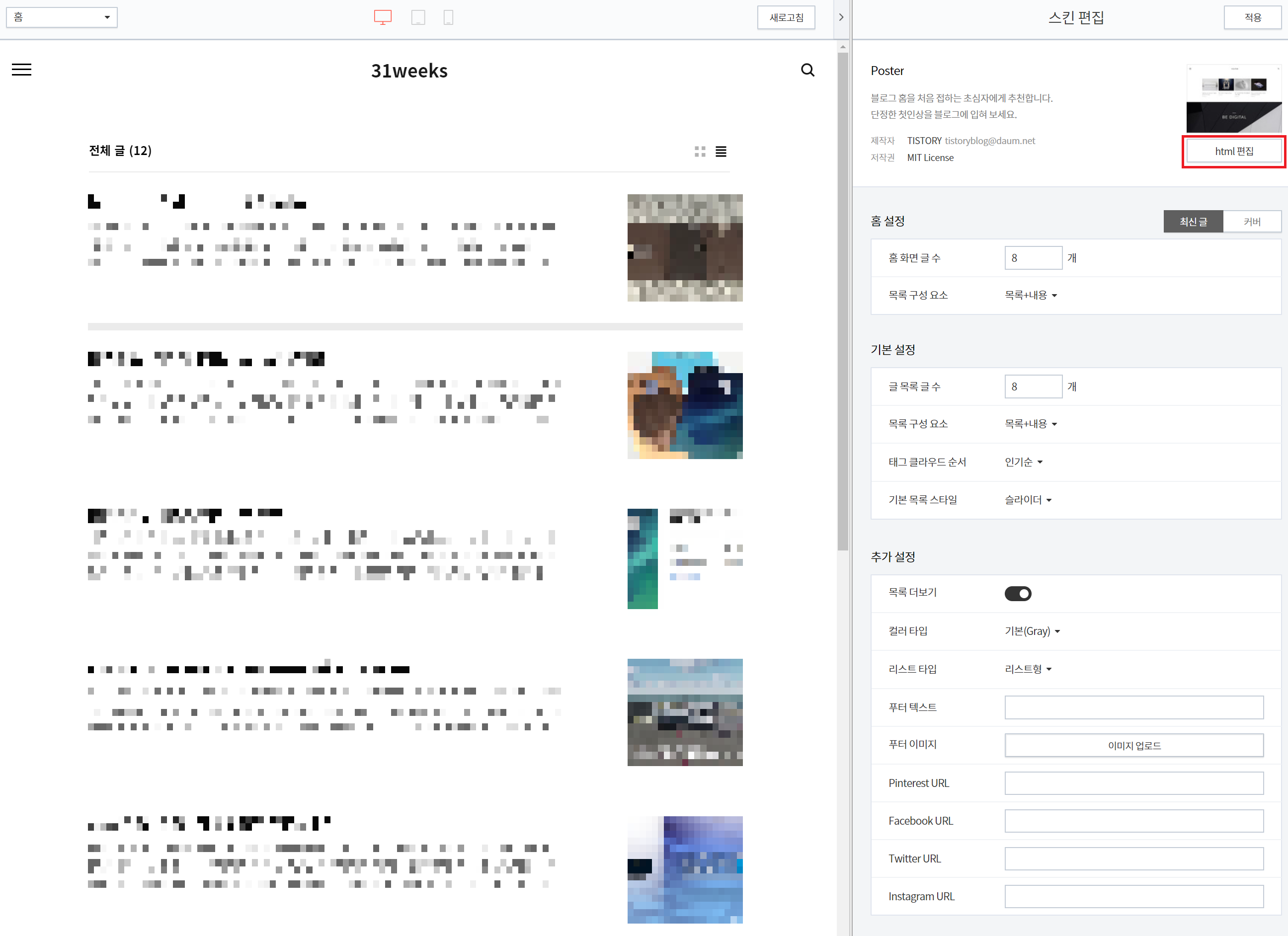 스킨 편집 화면으로 전환되면 우측 상단에 'html 편집'을 클릭한다.