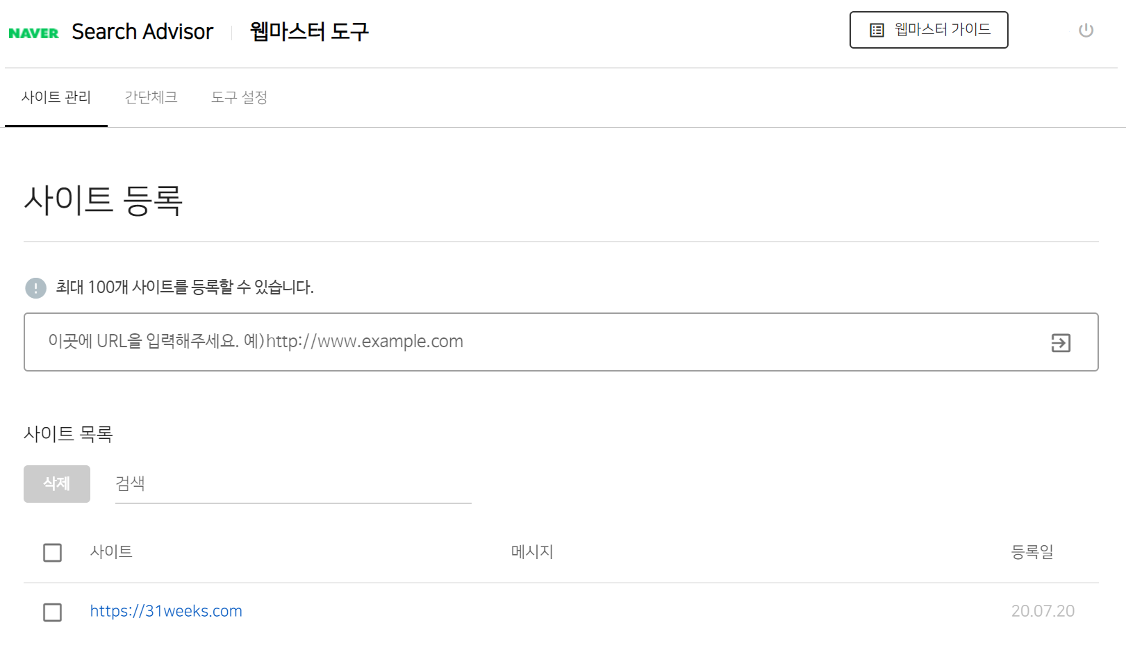 사이트 등록이 완료되면 '웹마스터 도구 - 사이트 관리'에서 등록된 사이트와 등록일을 확인할 수 있다.