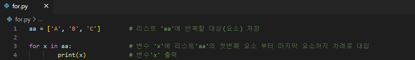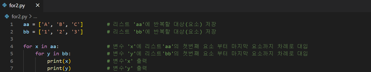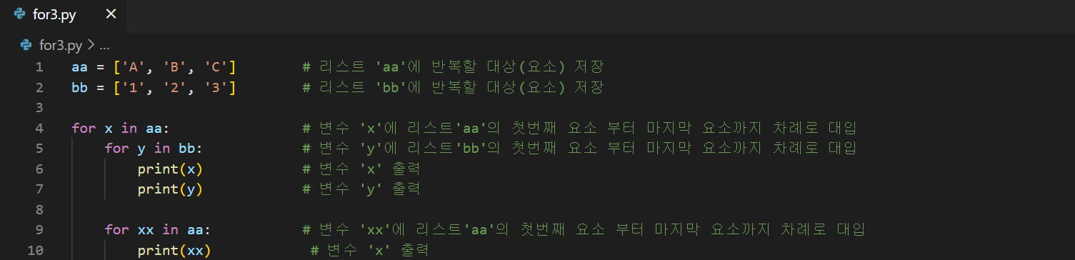 'New File' 아이콘을 클릭하고 파일 이름을 'for3.py'로 생성한 후, 아래의 코드를 입력한다. aa = ['A', 'B', 'C'] # 리스트 'aa'에 반복할 대상(요소) 저장 bb = ['1', '2', '3'] # 리스트 'bb'에 반복할 대상(요소) 저장 for x in aa: # 변수 'x'에 리스트'aa'의 첫번째 요소 부터 마지막 요소까지 차례로 대입 for y in bb: # 변수 'y'에 리스트'bb'의 첫번째 요소 부터 마지막 요소까지 차례로 대입 print(x) # 변수 'x' 출력 print(y) # 변수 'y' 출력 for xx in aa: # 변수 'xx'에 리스트'aa'의 첫번째 요소 부터 마지막 요소까지 차례로 대입 print(x) # 변수 'x' 출력 코드 작성..