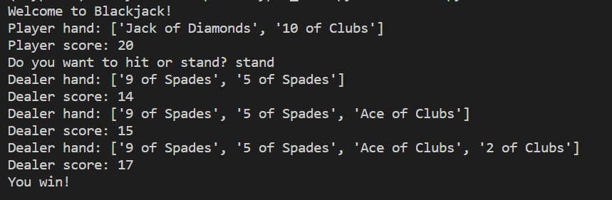 블랙잭 게임의 코드 작성하기전에 블랙잭의 룰을 먼저 알아보겠다. 간단한 텍스트로 진행되고, 컴퓨터와 1:1 플레이를 할 수 있는 블랙잭 게임이므로 아래의 세가지 룰 정도만 알아두고 적용하면 될 것 같다. 1. 힛(Hit) 처음 2장의 상태에서 카드를 더 뽑는 것을 Hit이라고 한다. 제스처로는 검지 손가락으로 테이블을 톡 내려주면 된다. 21이 되지 않는 한 얼마든지 원하는 만큼 카드를 뽑을 수 있다. 반면, 카드의 수 합산이 21이 넘으면 그 즉시 지게 되므로 뽑아서 높은 숫자를 만들되 얼마나 욕심을 부리지 않고 적당한 때에 멈추느냐가 블랙잭의 실력. 이 경우는 자신만이 아니라 딜러에게도 해당되어, 자신의 숫자가 낮더라도 딜러는 17 이상이 되기 전까지는 무조건 카드를 더 받아야 하기 때문에(일명 De..