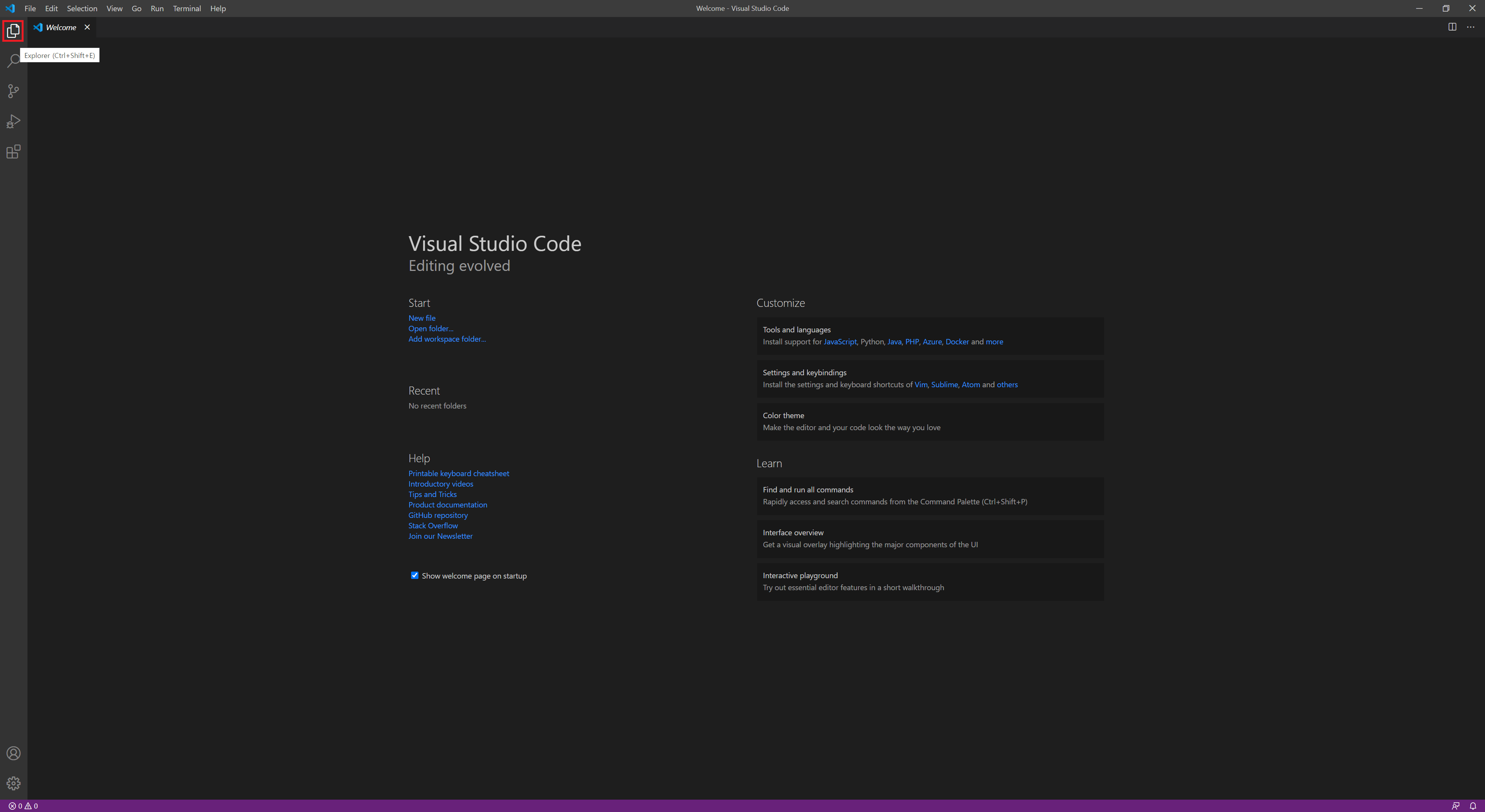 '파이썬 3.9.0 (64-bit)'와 '비주얼 스튜디오 코드 1.50.0 (64-bit)'의 설치가 완료되면 비주얼 스튜디오 코드를 실행시키고 좌측 상단에 있는 'Explorer' 탭을 클릭한다. 'Explorer' 탭으로 전환되면 'Open Folder'를 클릭한 뒤, 'C:\PythonWorkspace' 폴더를 만들고 '폴더 선택'을 클릭한다. 폴더 선택이 완료되면 'PYTHONWORKSPACE' 항목이 생성되어있는 것을 확인할 수 있고, 바로 오른쪽에 'New File' 아이콘을 클릭한 후, 'helloworld.py'를 입력해서 파일을 생성한다. 파일을 생성하고 나면 우측 하단의 알림 창이 뜨는데 'Select Python Interpreter'를 클릭한 뒤, 중앙 상단에 나타나는 항목 중, '..